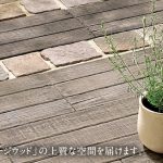 ウッドデッキの脇には枕木材と敷石を敷きます